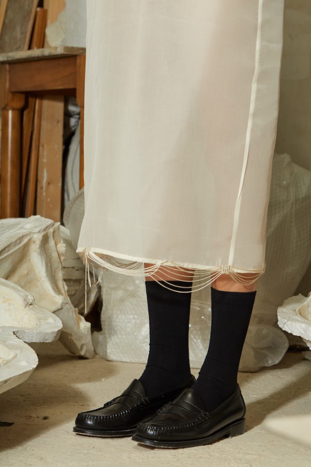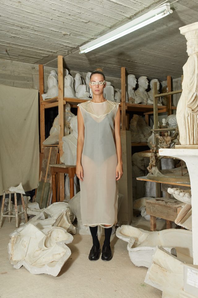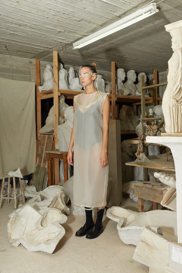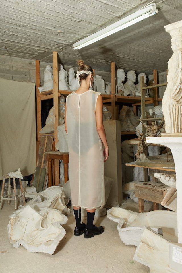 Ivory Silk Organza from Soufli Dress. Silk Organza is a Light-weight, Non-stretchy, sheer fabric. 100% Silk Organza. Unique handwoven artifacts by Studio Asevia embellished through front and back. Sleeveless. Back slit. Slips on. French seams. Cut for a slightly loose fit. Dry clean. Model is 180cm and is wearing a size S. Due to the unique approach for each piece, slight differences may occur. Please allow 20 days for your order to ship.