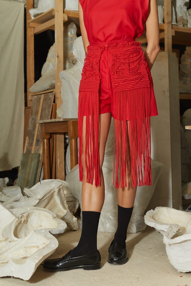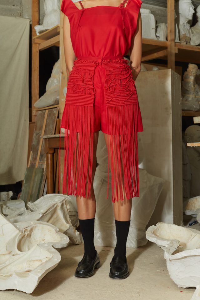 Red Tencel Shorts. Tencel is an environmentally friendly regenerated fabric from wood cellulose and is a Mid-weight, Non-stretchy fabric. 100% Tencel ; Embellishments 100% Recycled Cotton. High-rise. Unique handwoven artifacts by Studio Asevia embellished through front. Two side slit pockets. Concealed zip and button fastening. French seams. Fits true to size. Specialist clean only. Model is 180cm and is wearing a size S. Due to the unique approach for each piece, slight differences may occur. Please allow 20 days for your order to ship.