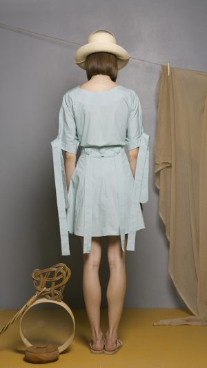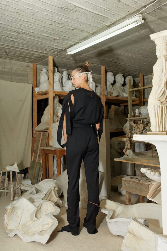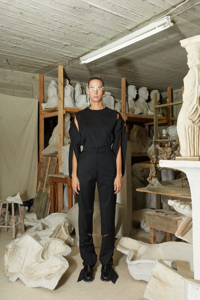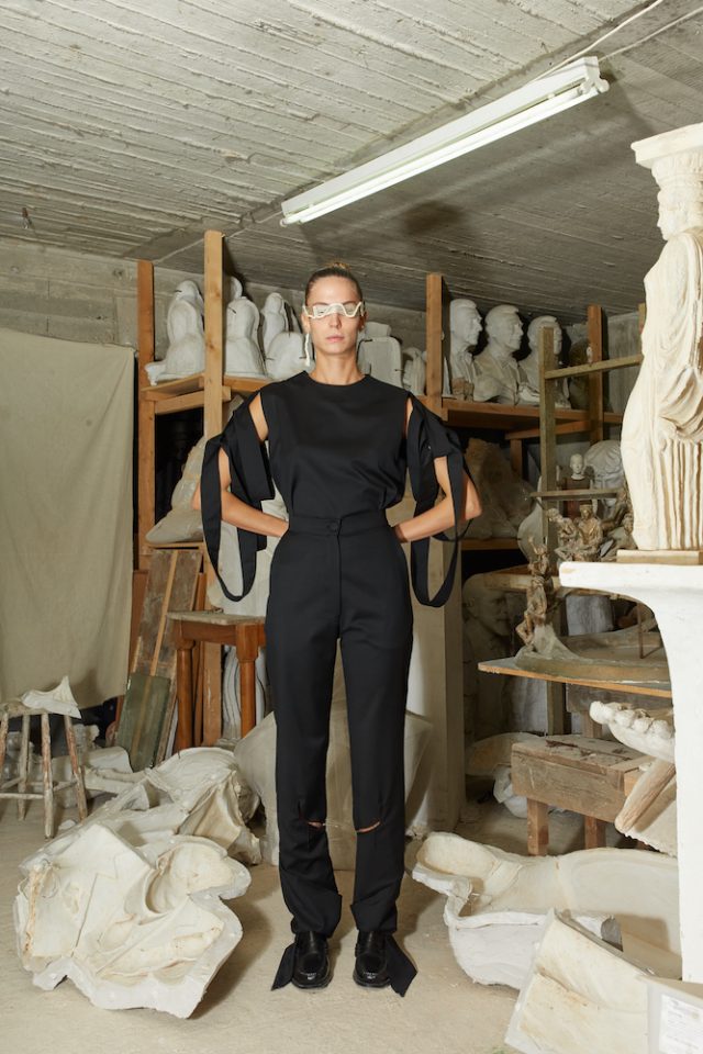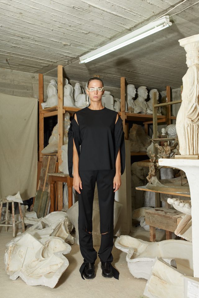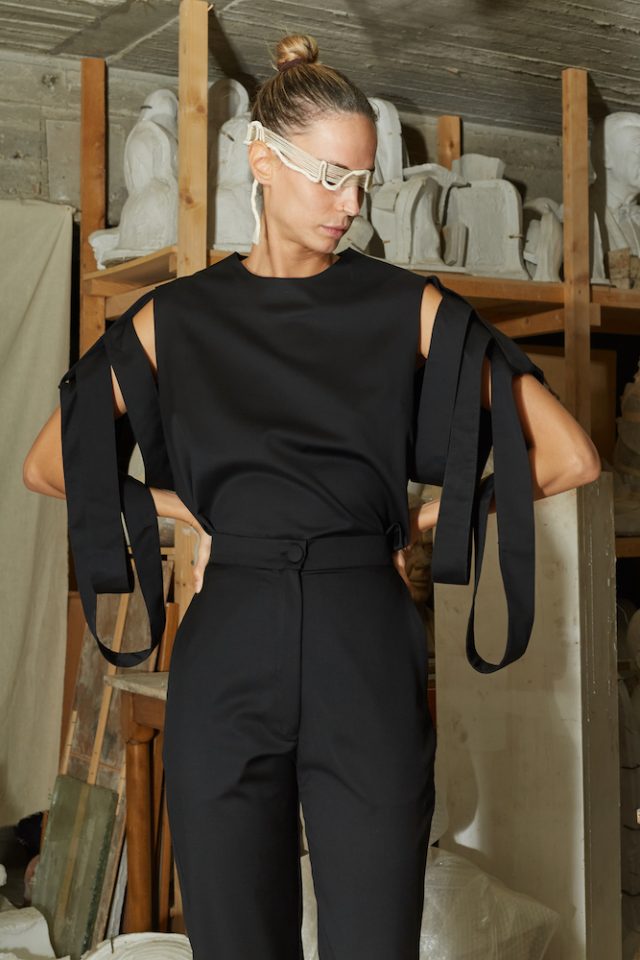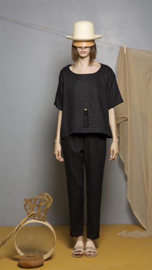 Black Cool Wool Blouse. Cool Wool is a Mid-weight, Non-stretchy fabric. 100% High Quality Cool Wool. Basket weaving inspired sleeves. Button-fastening keyhole at back. French seams. Cut for a loose fit. Hand Wash or Dry clean. Model is 180cm and is wearing a size S.