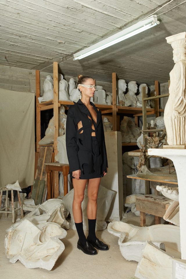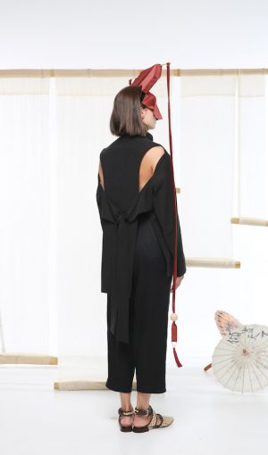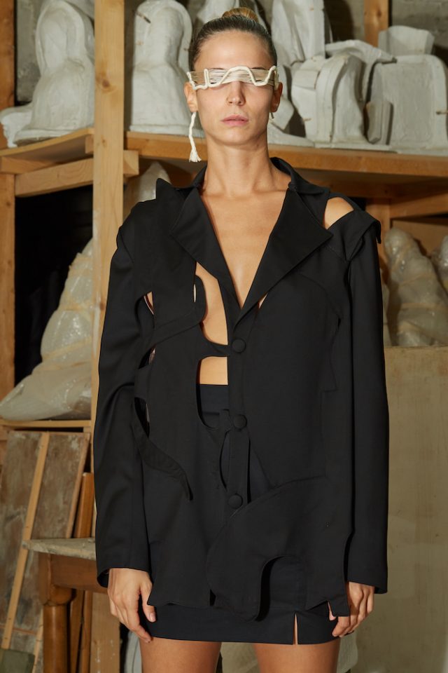 Black Cool Wool Jacket. Cool Wool is a Mid-weight, Non-stretchy fabric. 100% High Quality Cool Wool ; Lining 100% Viscose. Traditional marble sculpture inspired design through front. Cut-outs through front. Button-fastenings through front. Fully lined. Cut for a slightly loose fit. Dry clean. Model is 180cm and is wearing a size M.