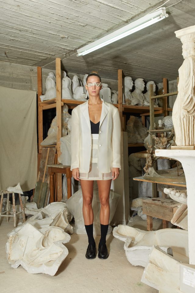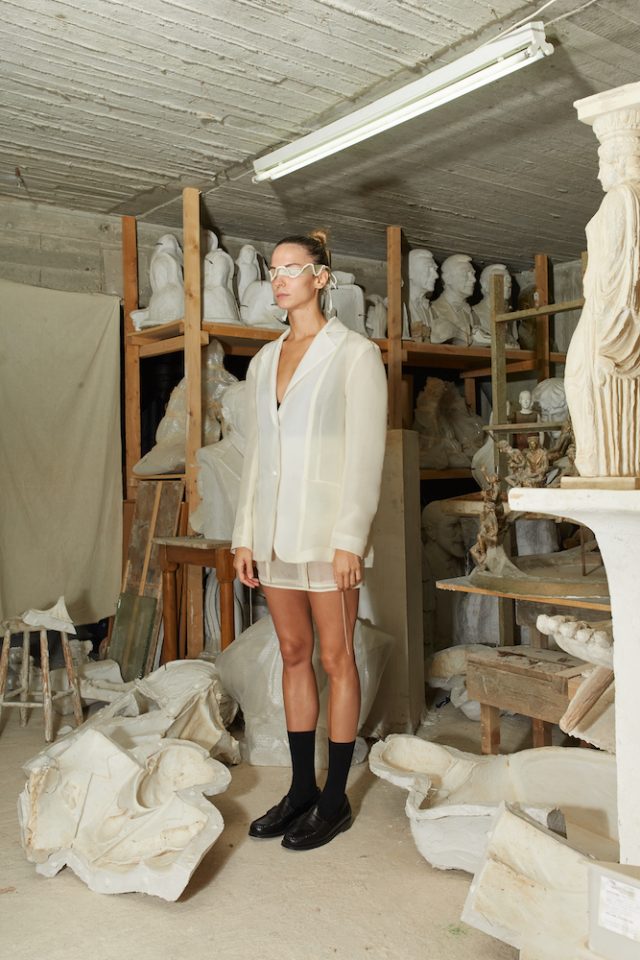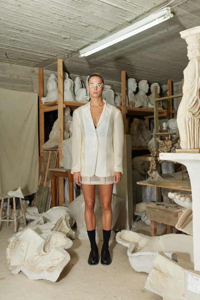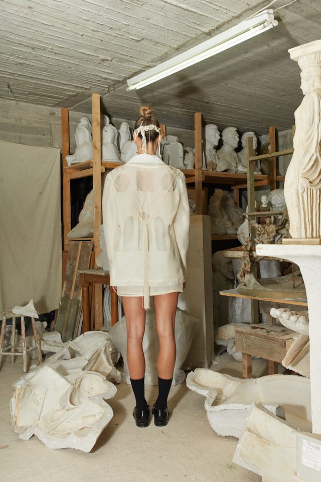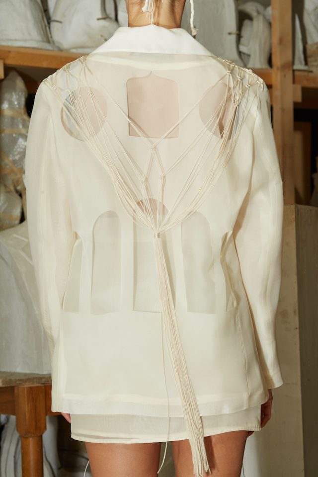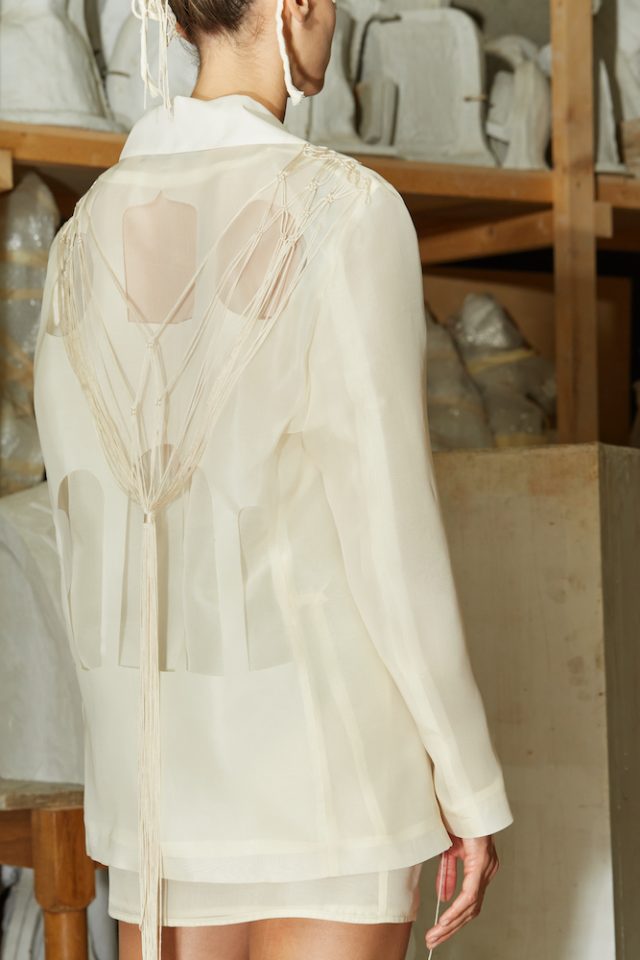 Ivory Silk Organza from Soufli Jacket. Silk Organza is a Light-weight, Non-stretchy, sheer fabric. 100% Silk Organza ; Lining 100% Silk Organza ; Embellishments 100% Silk. Traditional Tinian transom inspired design through back. Unique handwoven artifacts by Studio Asevia embellished at back. Button-fastenings through front. Fully lined. Cut for a slightly loose fit. Specialist clean only. Model is 180cm and is wearing a size M. Due to the unique approach for each piece, slight differences may occur. Please allow 20 days for your order to ship.