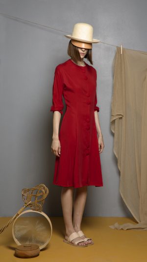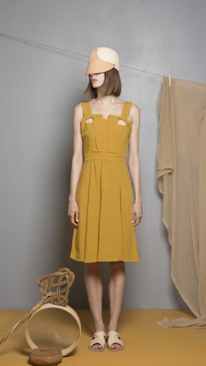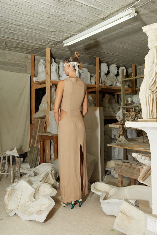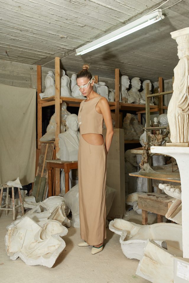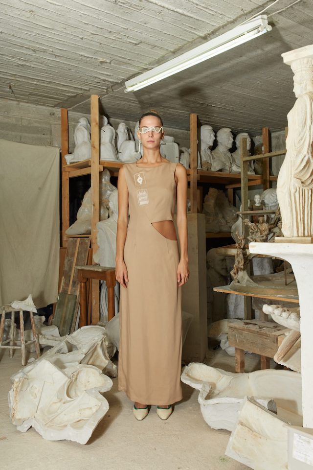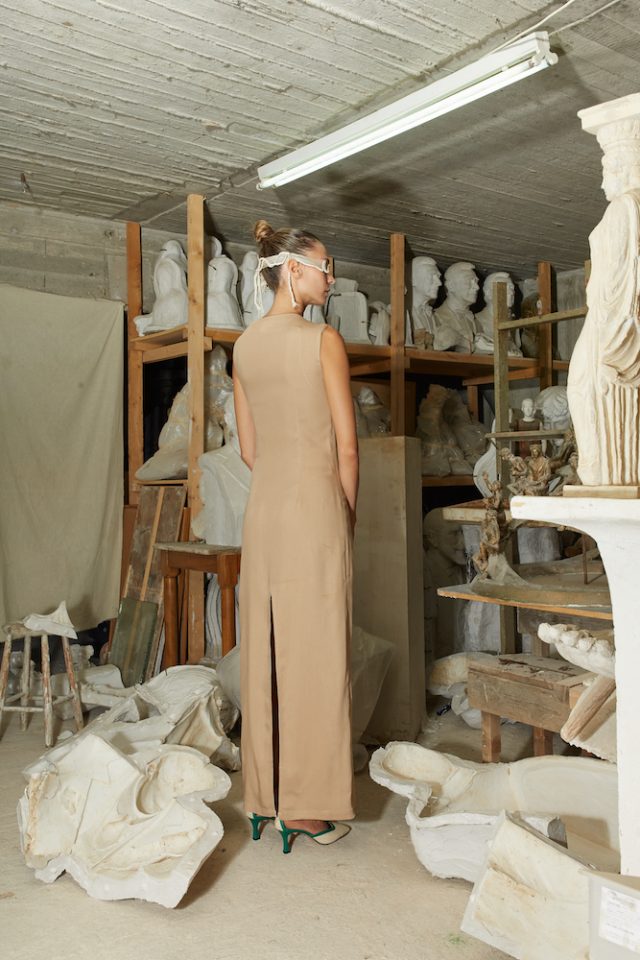 Sand Double Weave Tencel Dress. Double Weave Tencel is an environmentally friendly regenerated fabric from wood cellulose and is a Thick, Mid-weight, Non-stretchy fabric. 100% Tencel. Cut-out at front. Sleeveless. Tamata by Aristomenis Theodoropoulos at front. Back slit. Concealed zip fastening at side. French seams. Cut for a slim fit. Machine wash 30°C. Model is 180cm and is wearing a size S.