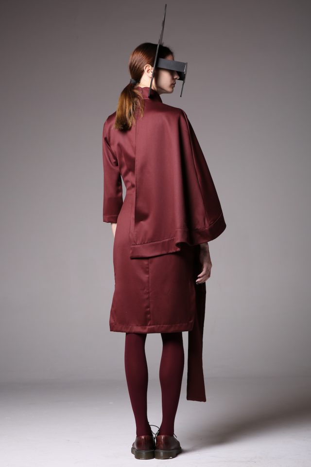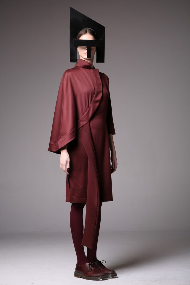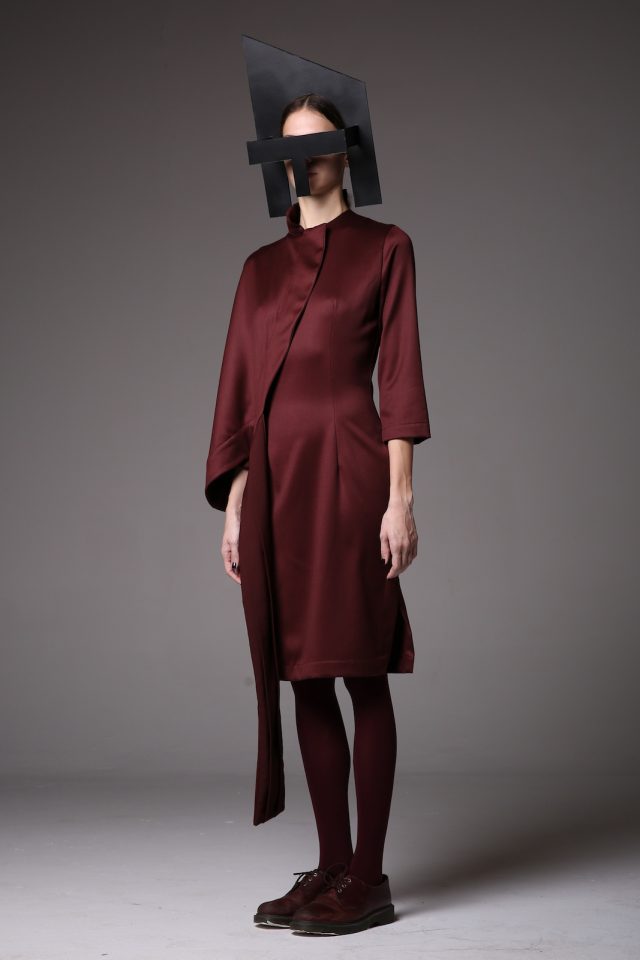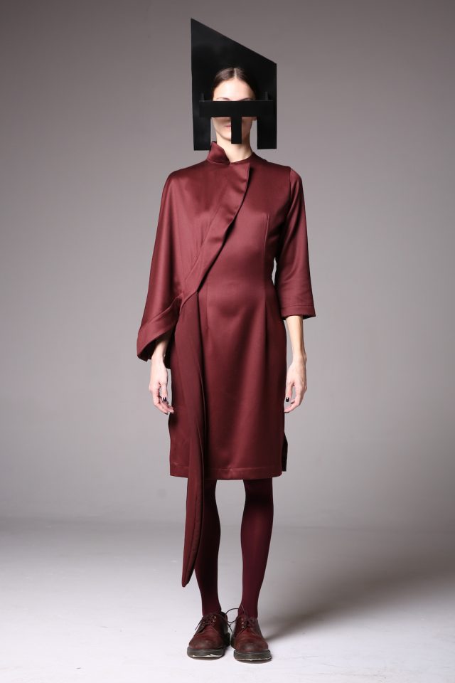 Burgundy wool dress. Wool is a Mid-weight, Non-stretchy fabric. 100% Wool. Cape through front and back. Asymmetrical stand collar. Pleated panel at front cape. Cropped sleeves. Two side vents. Concealed zip at back. French seams. Cut for a slim fit. Dry clean. Model is 180cm and is wearing a size M
