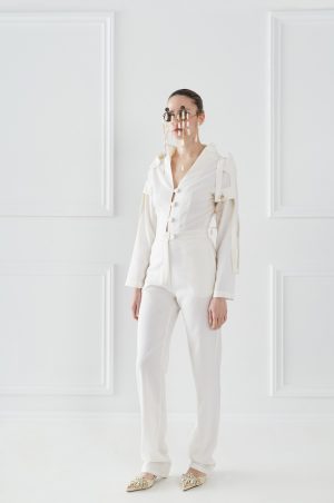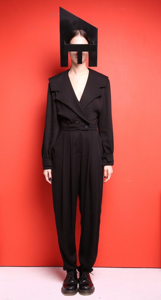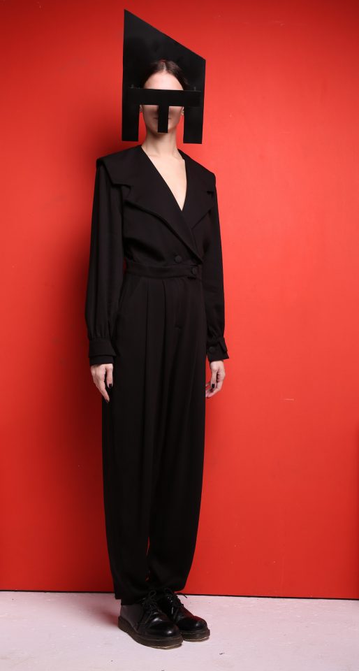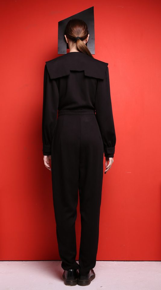 Black viscose jumpsuit. Viscose is a Mid-weight, Non-stretchy fabric. 100% Viscose. Nautical collar. Pleats at front. Two slant pockets. Concealed zip and button fastenings. High-rise. Tapered leg. French seams. Cut for a slightly loose fit. Machine wash 30°C. Model is 180cm and is wearing a size M