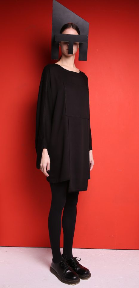 Black viscose dress. Viscose is a Mid-weight, Non-stretchy fabric. 100% Viscose. Panel at front. Panels at sleeves. Cut for a loose fit. Slips on. French seams. Machine wash 30°C. Model is 180cm and is wearing a size M