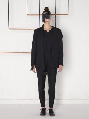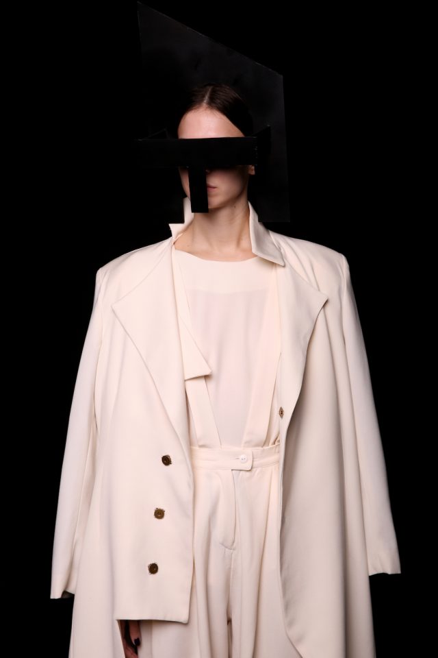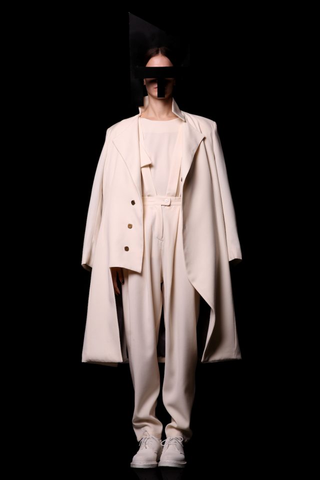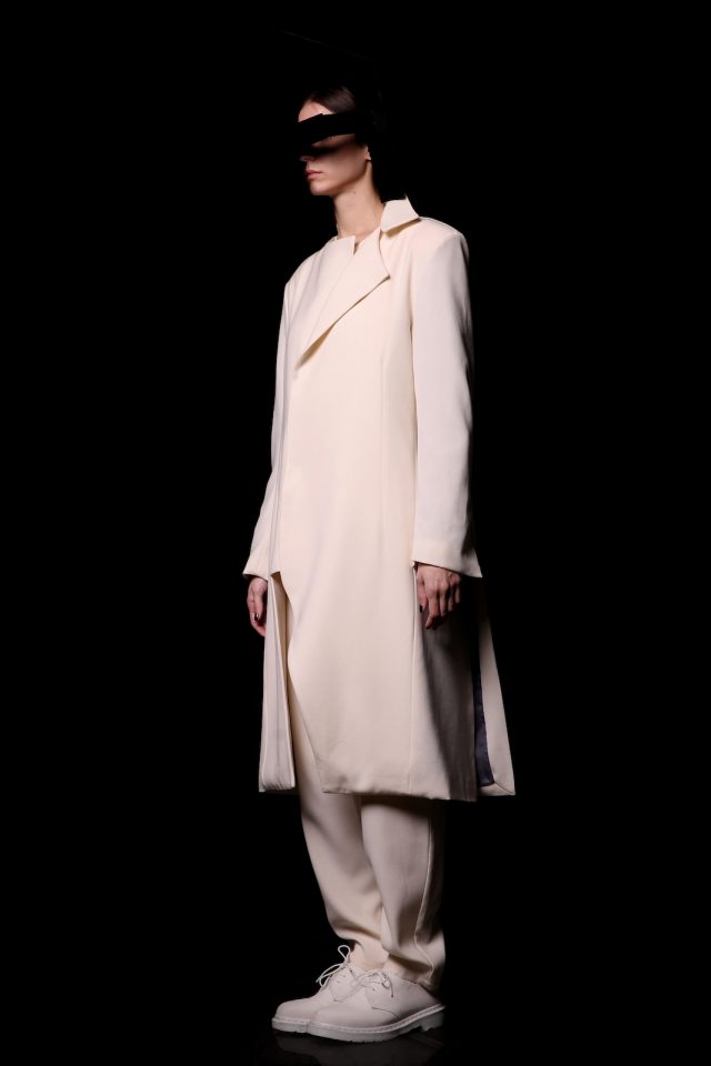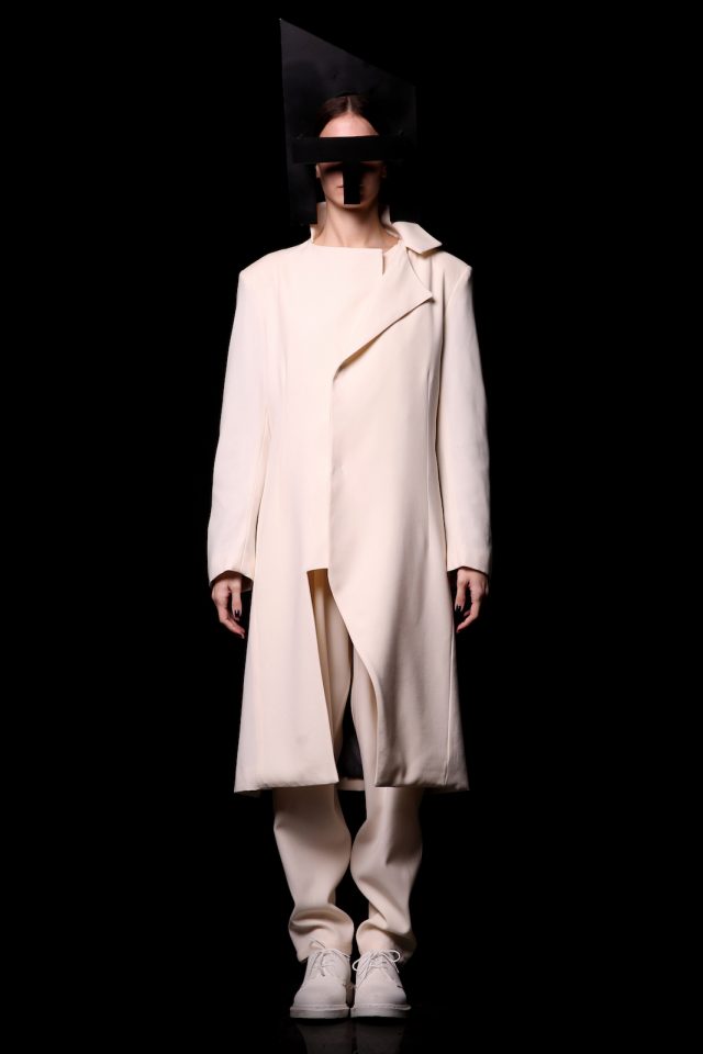 Ivory wool jacket. Wool is a Mid-weight, Non-stretchy fabric. 100% Wool ; Lining 100% Viscose. Asymmetrical stand collar. Asymmetrical lapels. Concealed snap fastenings through front. Two back vents. Padded shoulders. Cut for a slightly loose fit. Fully lined. French seams. Dry clean. Model is 180cm and is wearing a size M