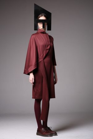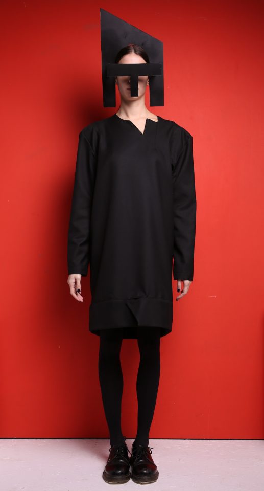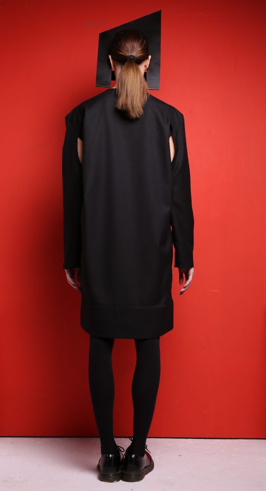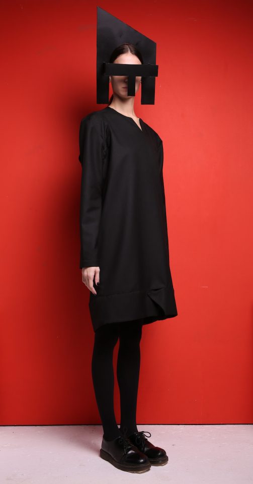 Black wool dress. Wool is a Mid-weight, Non-stretchy fabric. 100% Wool. Cut-out at armhole. Cut for a loose fit. Slips on. French seams. Dry clean. Model is 180cm and is wearing a size M