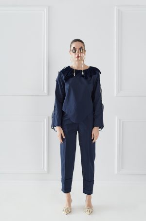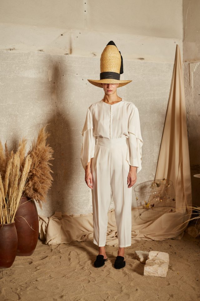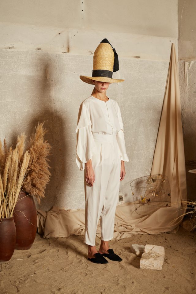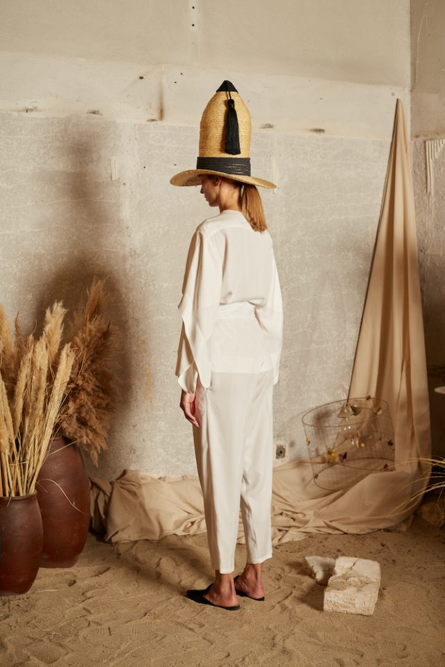 Ivory Tencel Trousers. Tencel is an environmentally friendly regenerated fabric from wood cellulose and is a Mid-weight, Non-stretchy fabric. 100% Tencel. Two structured slant pockets with sand-coloured piping. Pleats through front. Concealed zip at side. High-rise. Tapered leg. French seams. Cut for a slightly loose fit. Machine wash 30°C. Model is 180cm and is wearing a size S.