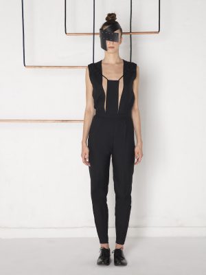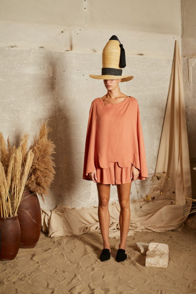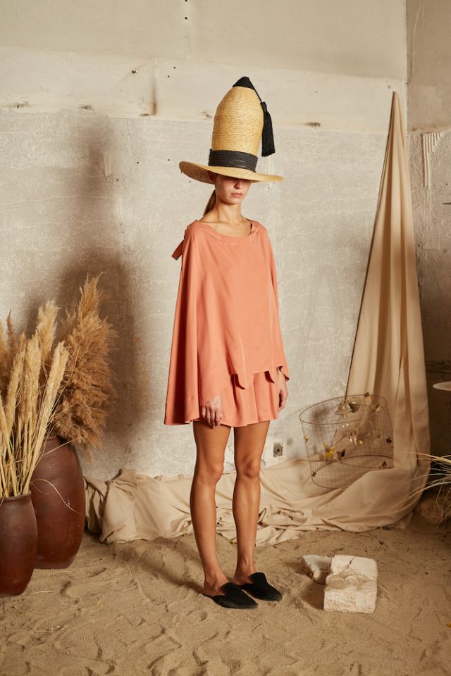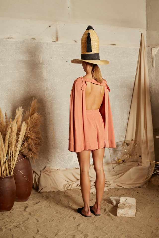 Salmon Pink Tencel Jumpsuit. Tencel is an environmentally friendly regenerated fabric from wood cellulose and is a Mid-weight, Non-stretchy fabric. 100% Tencel. Structured Portrait neckline. Cape through front and back. Structured asymmetrical hem at cape. Backless. Two button-fastening ribbons at back. Sleeveless. Pleats through front at shorts. Concealed zip fastening at back. Two side slit pockets. French seams. Cut for a slightly loose fit. Machine wash 30°C. Model is 180cm and is wearing a size S. ΑΤΤΕΝΤΙΟΝ = We have replaced the Salmon Pink colour with Dusty Pink. Please see last image for colour reference.