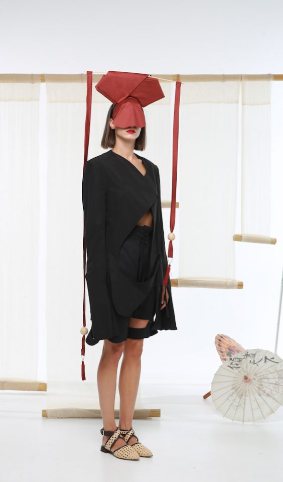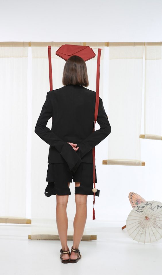 Black Tencel-Cotton Blend Jacket. Tencel-Cotton Blend is a Mid-weight, Non-stretchy fabric. 46% Tencel ; 54% Cotton | Lining 100% Silk. Collarless. Asymmetrical at front. Bound seams, visible from the sheer silk lining. Exaggerated length at sleeves. Fully lined. Ribbon fastenings through front. Cut for a slightly loose fit. Dry Clean. Model is 180cm and is wearing a size M