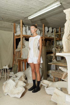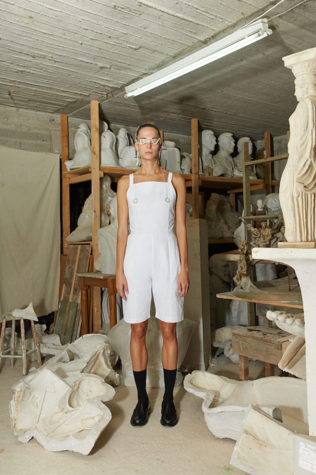 White Cotton Jumpsuit. Cotton is a Mid-weight, Non-stretchy fabric. 100% Cotton ; Embellishments 100% Silk. Sleeveless. Unique handwoven artifacts by Studio Asevia embellished at front. Two side slit pockets. Concealed zip at back. French seams. Fits true to size. Specialist clean only. Model is 180cm and is wearing a size S. Due to the unique approach for each piece, slight differences may occur. Please allow 10 days for your order to ship.