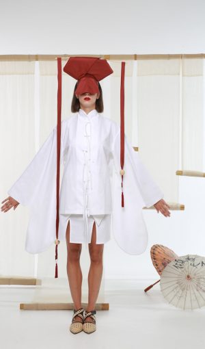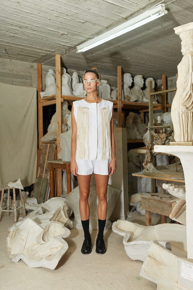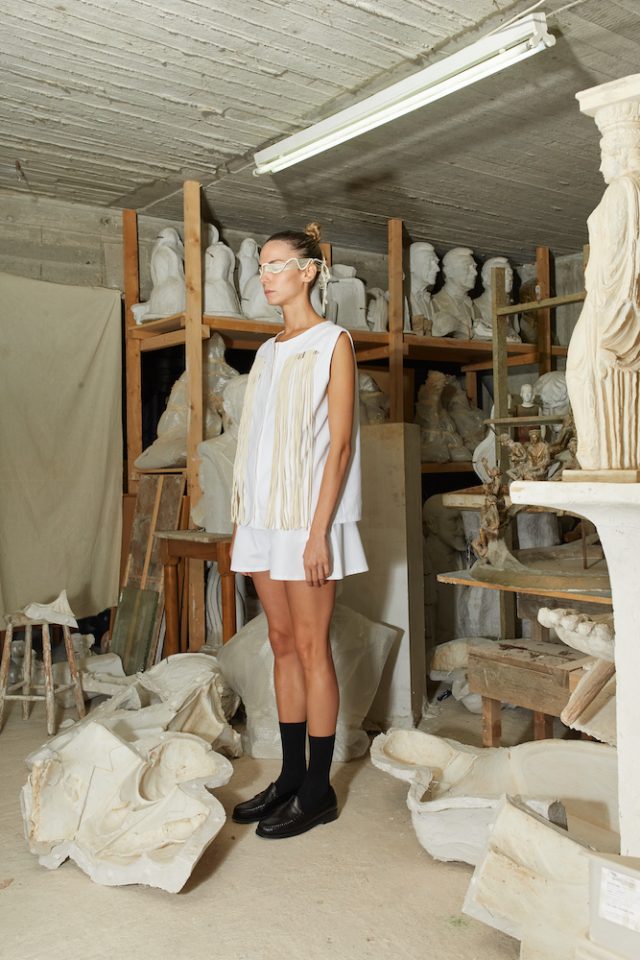 White Cotton Shirt. Cotton is a Mid-weight, Non-stretchy fabric. 100% Cotton ; Embellishments 100% Recycled Cotton. Sleeveless. Unique handwoven artifacts by Studio Asevia embellished through front. Concealed button fastenings through front. Cut for a slightly loose fit. French seams. Specialist clean only. Model is 180cm and is wearing a size S. Due to the unique approach for each piece, slight differences may occur. Please allow 10 days for your order to ship.