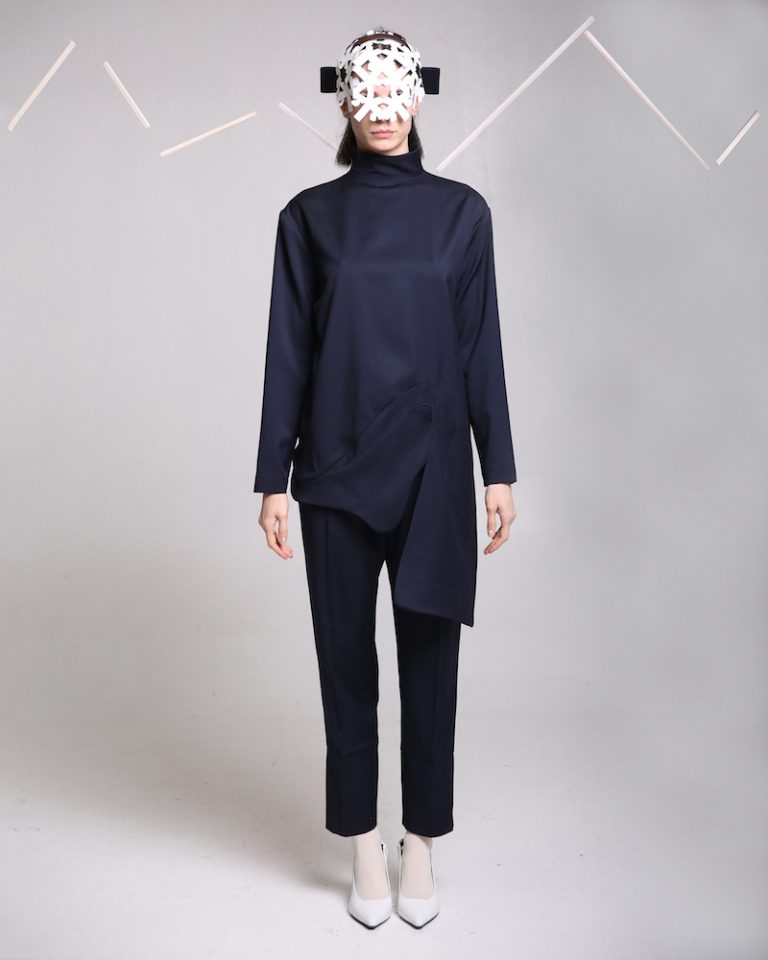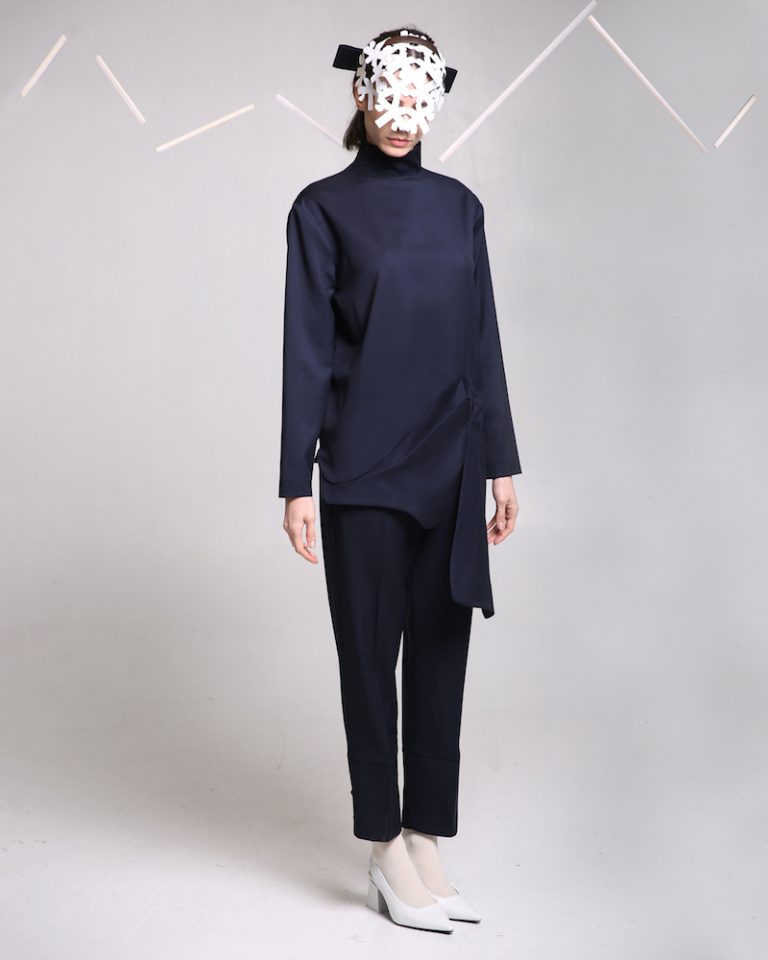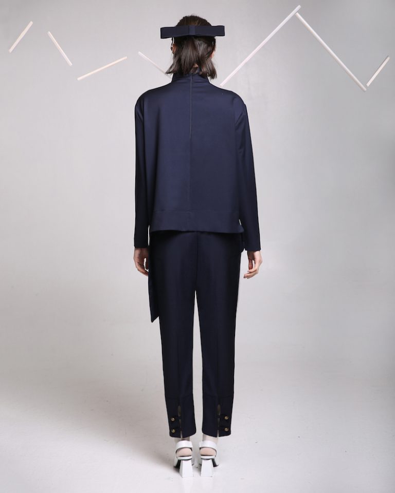 Navy Blue Wool Trousers. Wool is a Mid-weight, Non-stretchy fabric. 100% Wool. Handmade button-fastening keyholes at back vents. Two slant pockets. Concealed zip and button fastening. High-rise. Tapered leg. French seams. Fits true to size. Dry clean. Model is 180cm and is wearing a size S