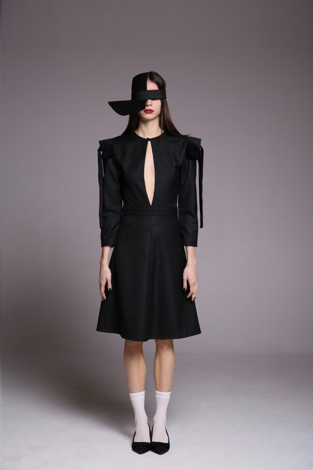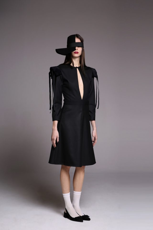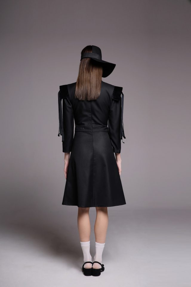 Black wool and velour dress. Wool and Velour are Mid-weight, Non-stretchy fabrics. Fabric 1: 100% Wool ; Fabric 2: 100% Velour Cotton. Velour epaulettes. Velour ribbons at epaulettes. Slit at front. Concealed zip at back. Button fastening at front. Padded shoulders. French seams. Fitted at the waist, cut for a slim fit. Dry clean. Model is 180cm and is wearing a size M
