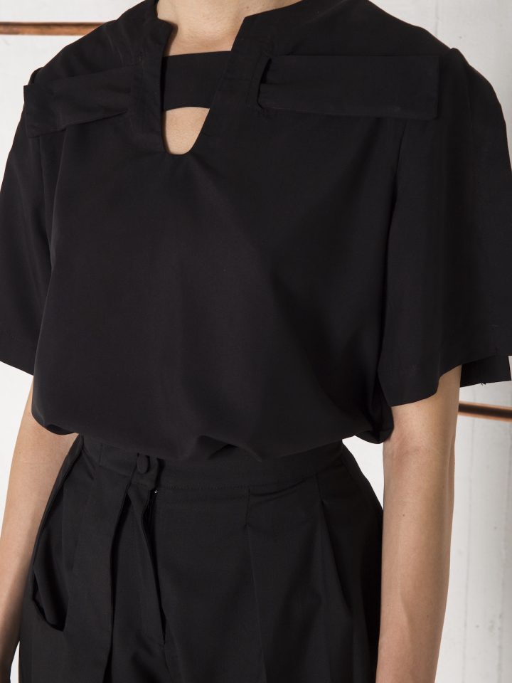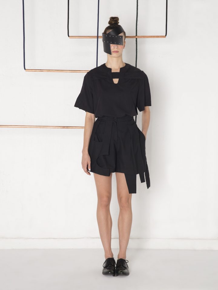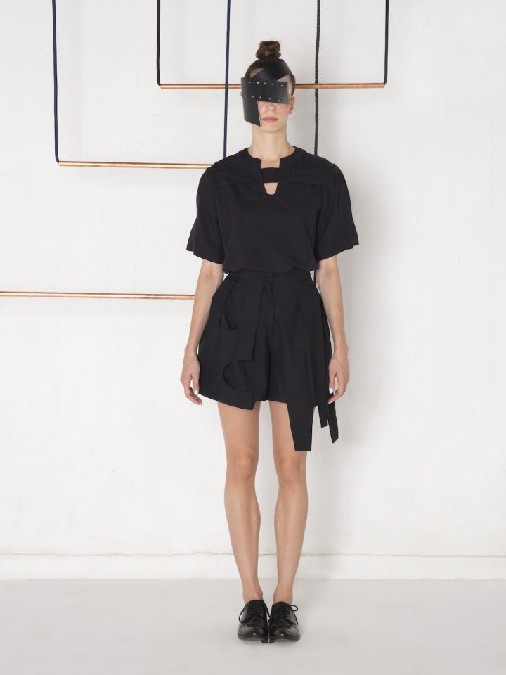 Black cool wool shorts. Cool wool is a Mid-weight, Non-stretchy fabric. 80% Cool Wool, 20% Dacron. Pleats at front. Two side slit pockets. Two pockets at back. Asymmetrical hems. Concealed zip and button fastening. High-rise. French seams. Cut for a slightly loose fit. Dry clean. Model is 180cm and is wearing a size M