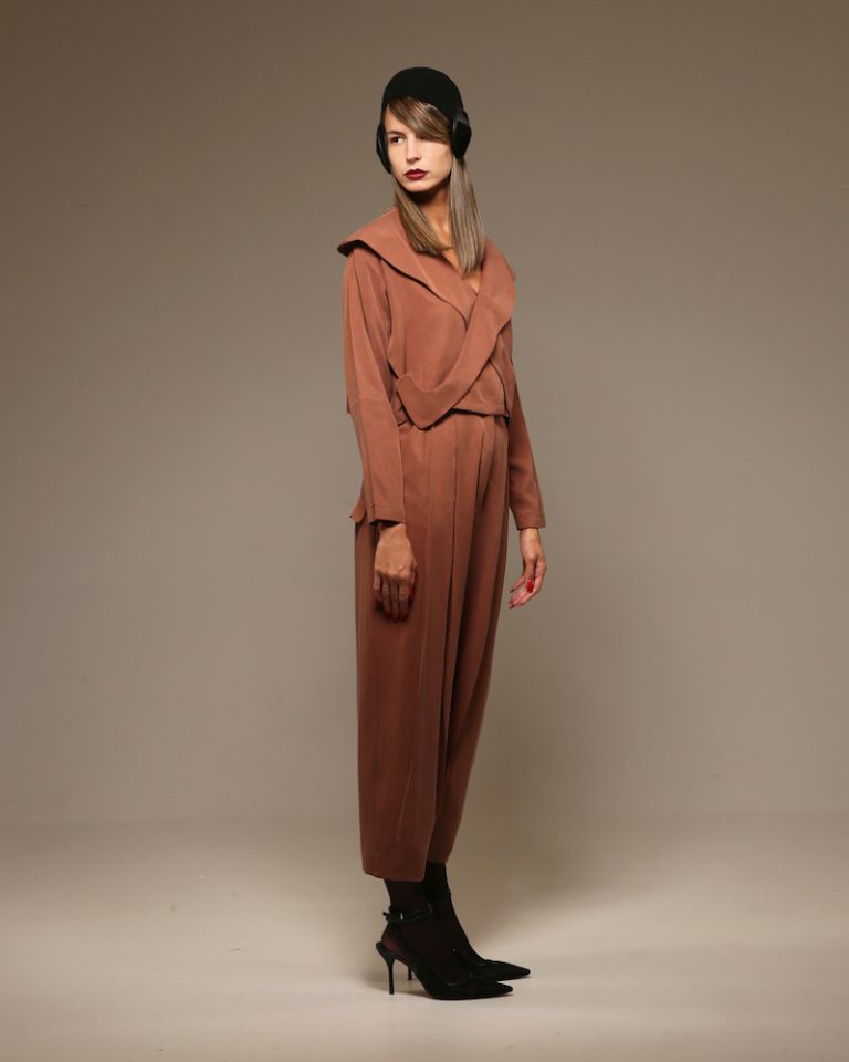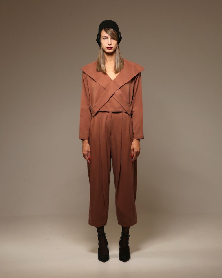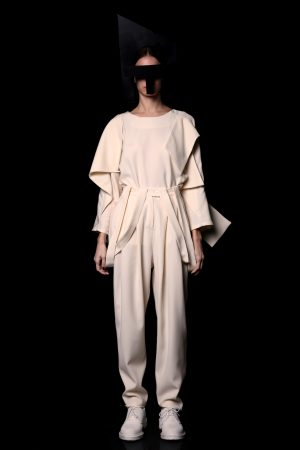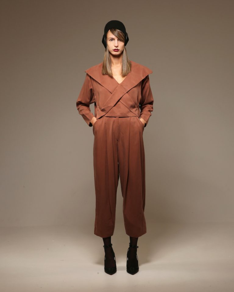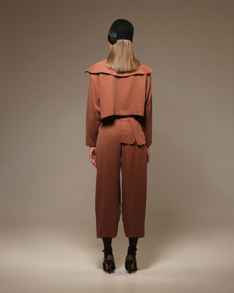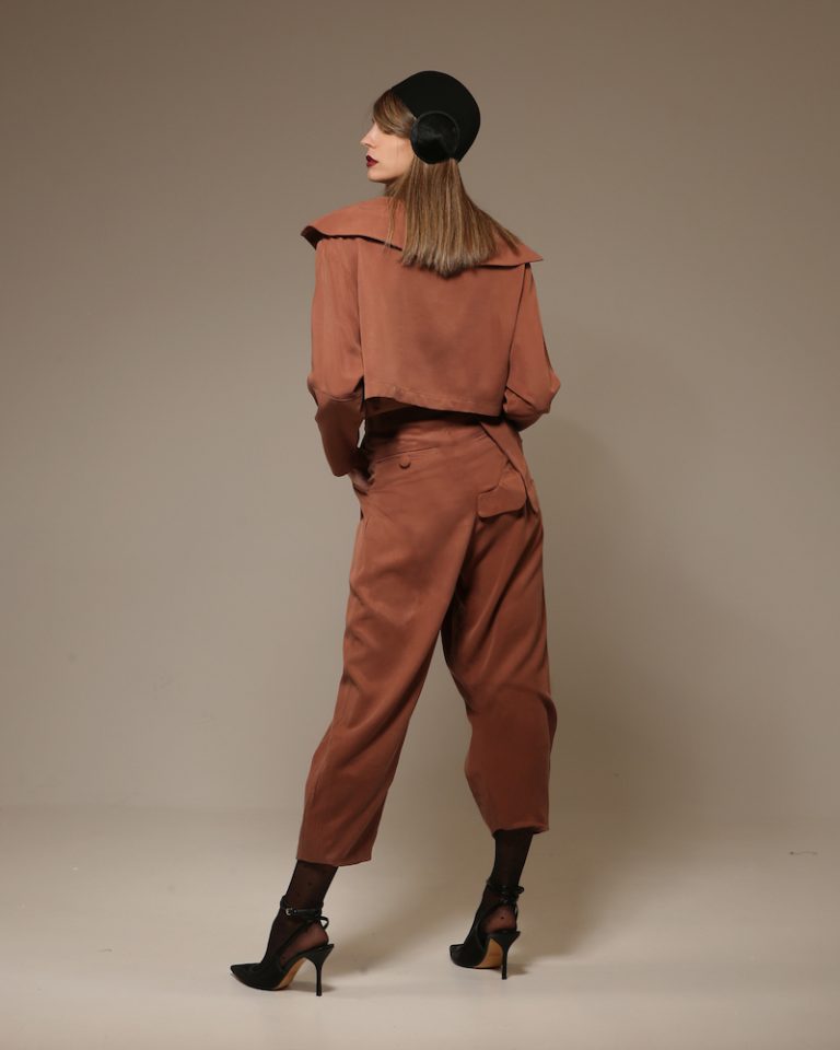 Tabac Tencel Trousers. Tencel is an environmentally friendly regenerated fabric from wood cellulose and is a Mid-weight, Non-stretchy fabric. 100% Tencel. Pleats through front and back. Decorative ice hockey stick-like straps. Cropped. Two side slit pockets. Concealed zip fastening. High-rise. Tapered leg. French seams. Cut for a slightly loose fit. Machine wash 30°C. Model is 180cm and is wearing a size S.