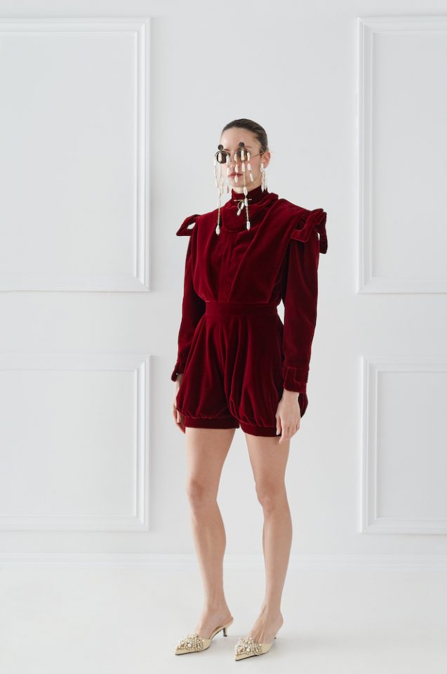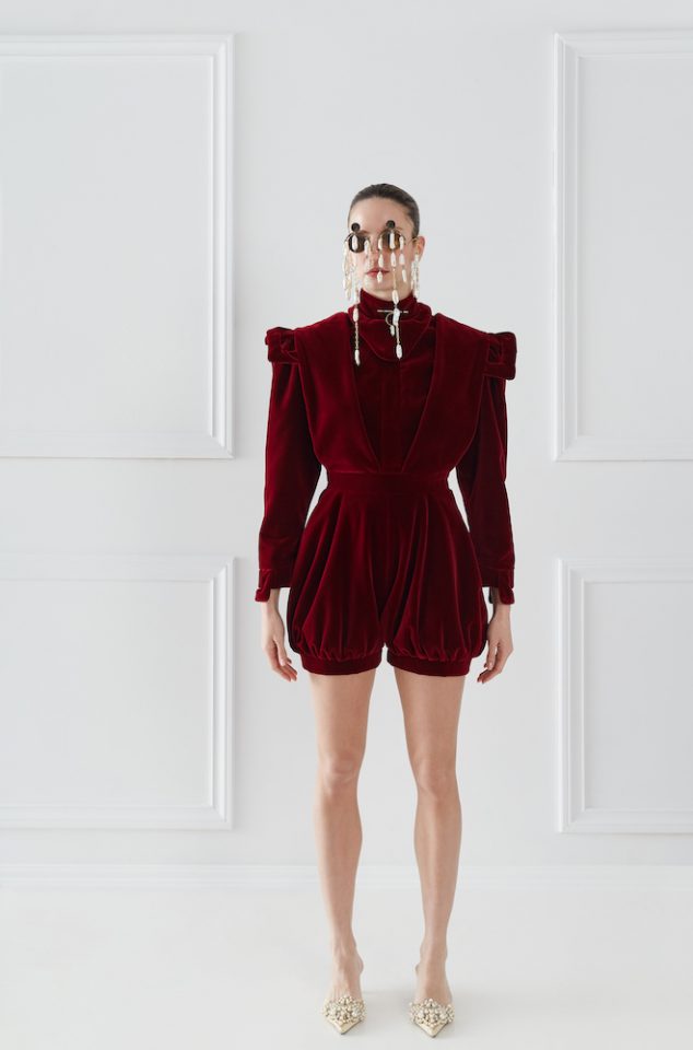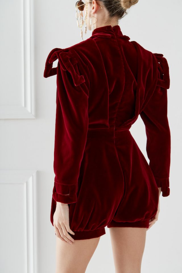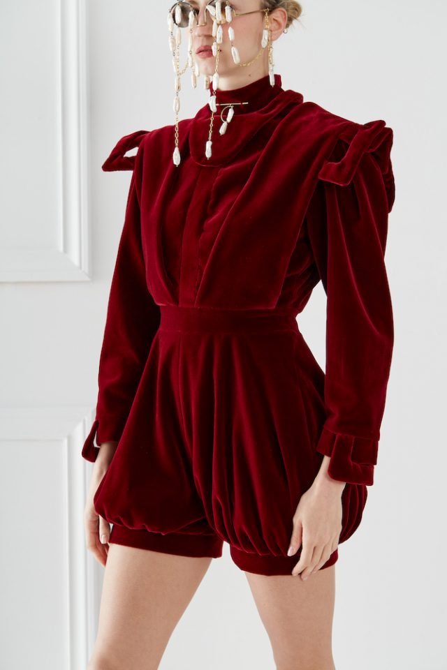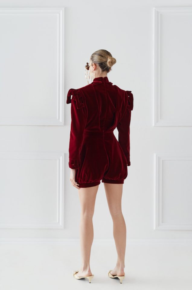 Dark Crimson Velour Jumpsuit. Velour is a Mid-weight, Non-stretchy fabric. 100% Velour Cotton ; Lining 100% Viscose. Straps at front and back. Decorative chain-like velour embellishments at straps and cuffs. Stand double collar. Concealed zip fastening at back. Fitted at the waist and bust, slightly loose at the hip. High-rise. Fully lined. Cut for a slim fit. Dry clean. Model is 180cm and is wearing a size S.