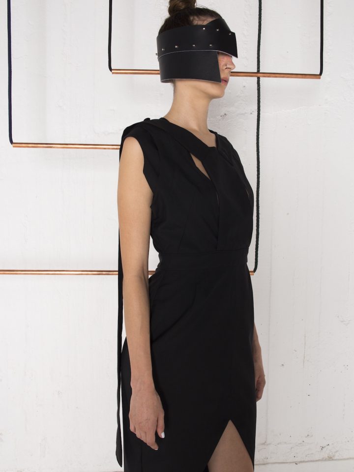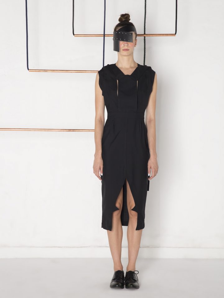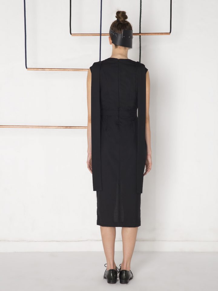 Black cool wool dress. Cool wool is a Mid-weight, Non-stretchy fabric. 80% Cool Wool, 20% Dacron. Front vent. Panel at front. Concealed zip at back. Button fastnings at shoulders. Sleeveless. French seams. Cut for a slim fit. Dry clean. Model is 180cm and is wearing a size M