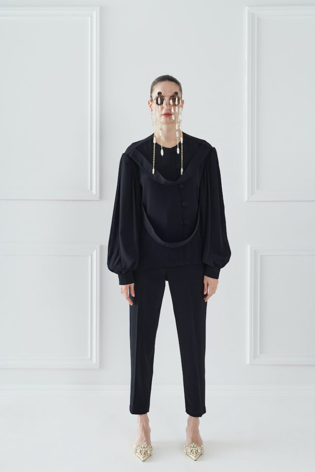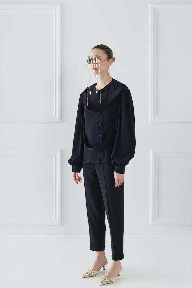 Black Silk Shirt. Silk is a Mid-weight, Non-stretchy fabric. 100% Silk. Two hanging ribbons at front or back. Bishop sleeves. Handmade button fastenings through front. French seams. Cut for a slightly loose fit. Hand Wash or Dry clean. Model is 180cm and is wearing a size S.