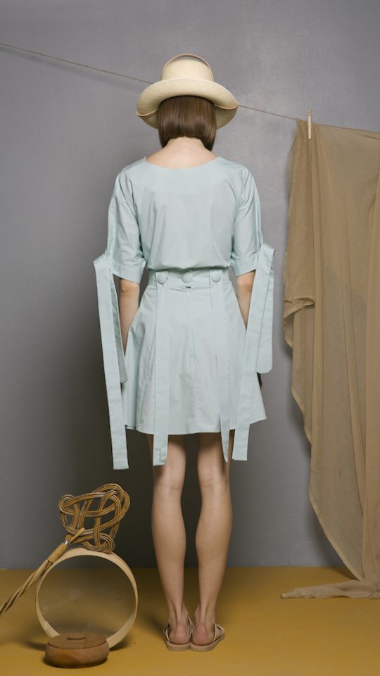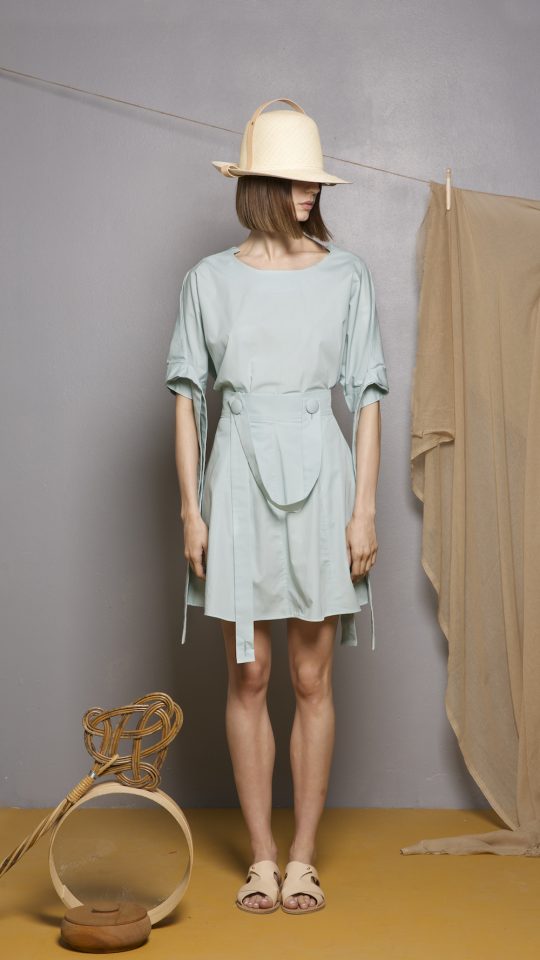 Amazonite Mint Cotton Blouse. Cotton is a Light-weight, Non-stretchy fabric. 100% Cotton. Exaggerated straps at sleeve hem. Short-sleeved. Oversized. Slips on. French seams. Cut for a loose fit. Machine wash 30°C. Model is 180cm and is wearing a size M