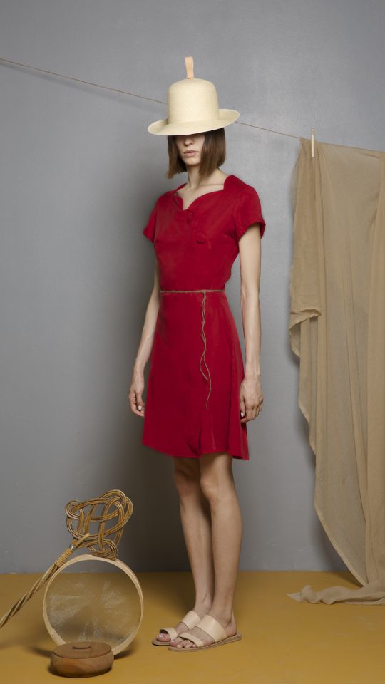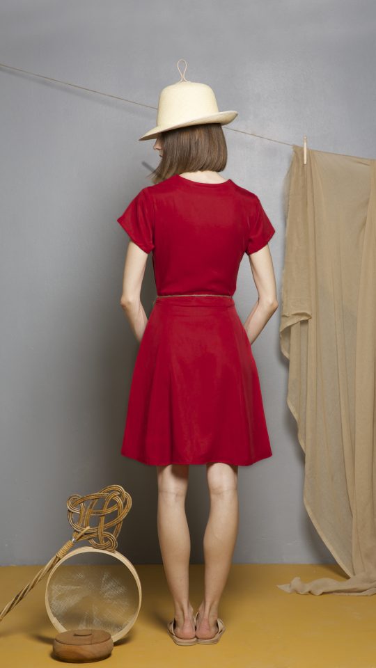 Bauxite Red Tencel Dress. Tencel is an enviromentally friendly regenerated fabric from wood cellulose and is a Mid-weight, Non-stretchy fabric. 100% Tencel. Button fastenings and concealed button fastenings through front. Short-sleeved. Two side slit pockets. Fitted at the bust and waist, slighlty loose at the hip. French seams. Fits true to size. Machine wash 30°C. Model is 180cm and is wearing a size S