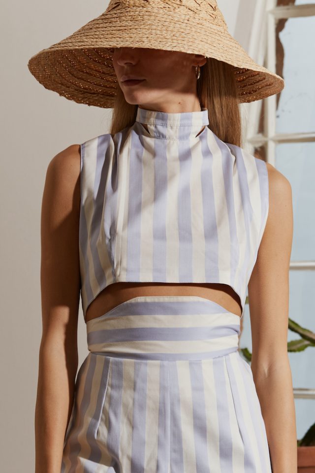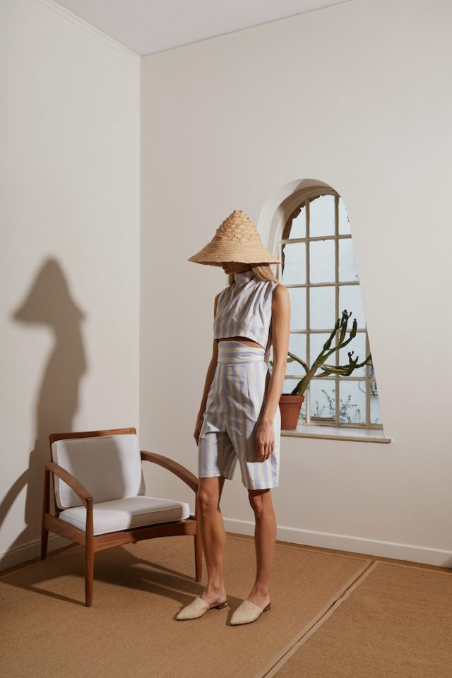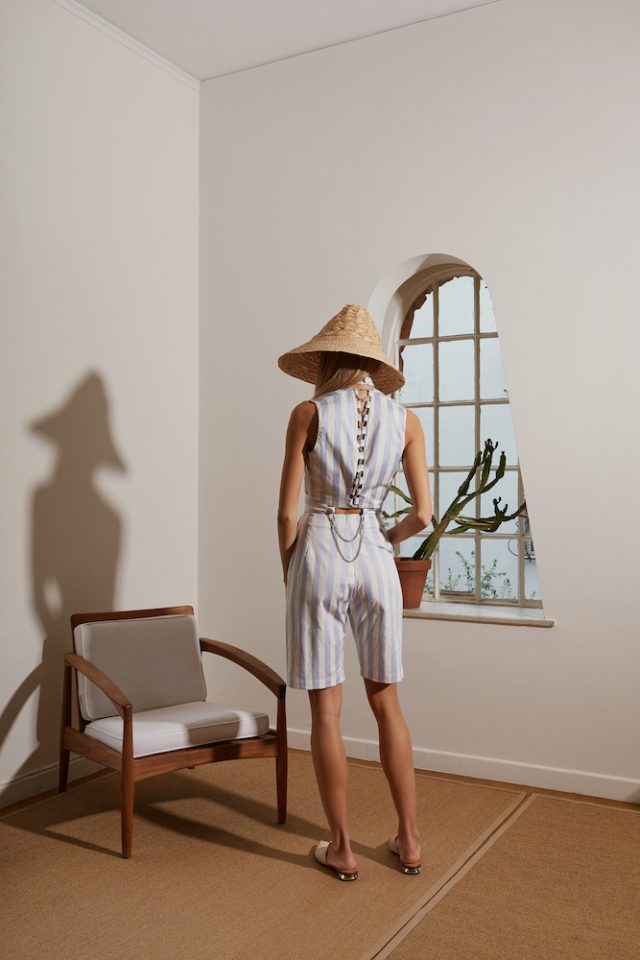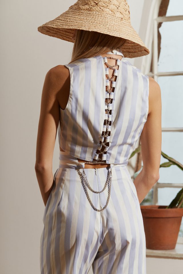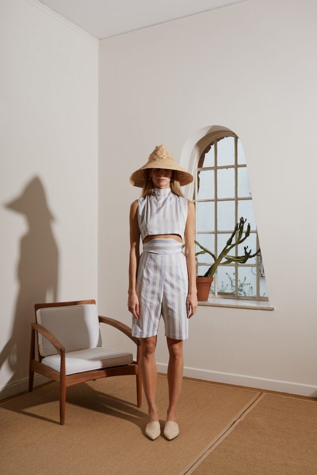 Striped Fine Cotton Bermuda. Fine Cotton is a Light-weight, Non-stretchy fabric. 100% High Quality Cotton. Asymmetrical Belt. High-rise. Two side slit pockets. Concealed zip and chain fastening at back. Fits true to size. French seams. Machine wash 30°C, removing the chain. Model is 180cm and is wearing a size S.