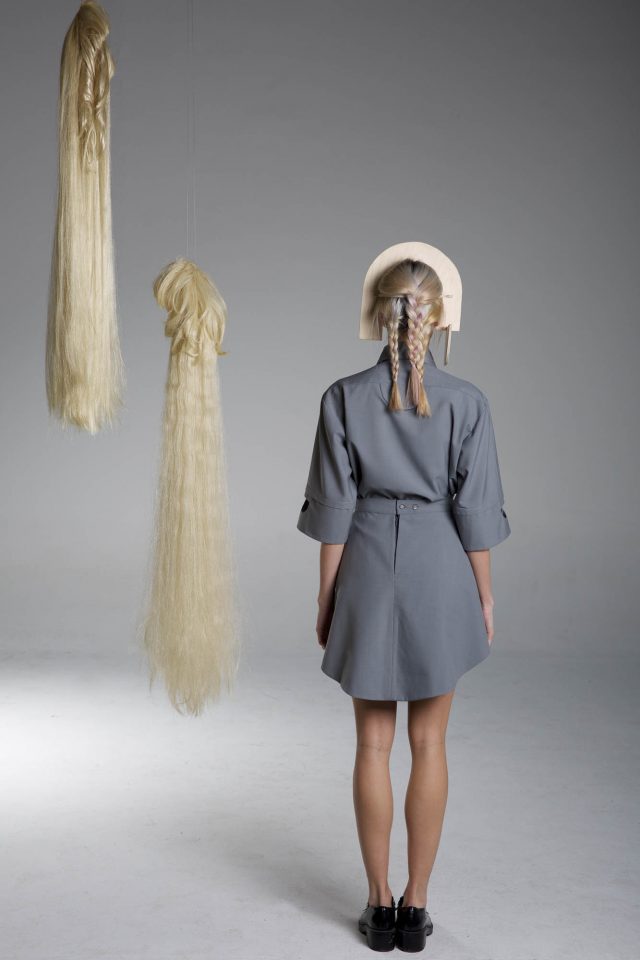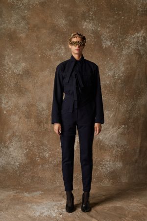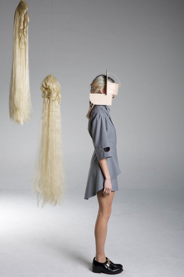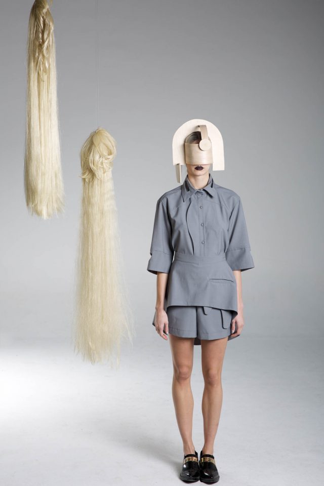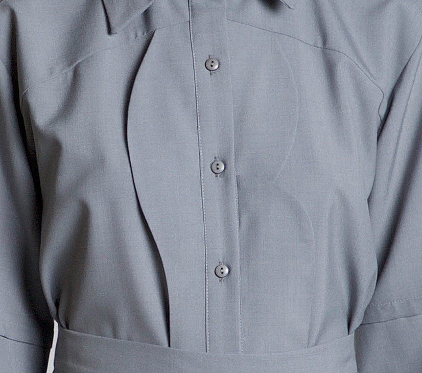 Grey cool wool shirt. Mid-weight, Non-stretchy fabric. 80% Cool Wool, 20% Dacron. Short-sleeved. Cut-outs at collar and sleeves. Grey cool wool panels at front. Button fastenings through front. French seams. Cut for a slightly loose fit. Dry clean.