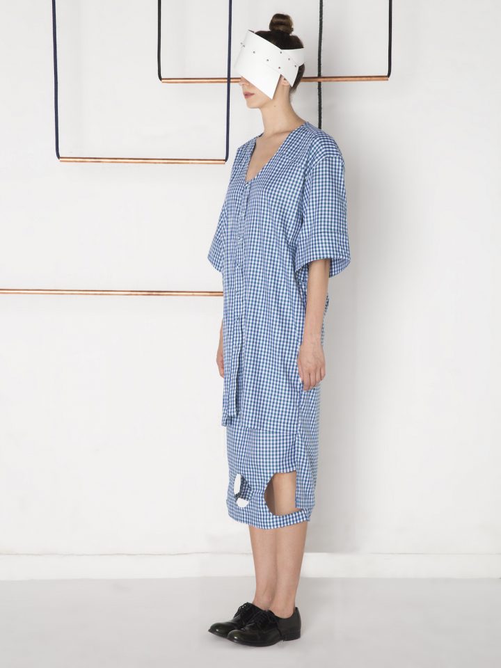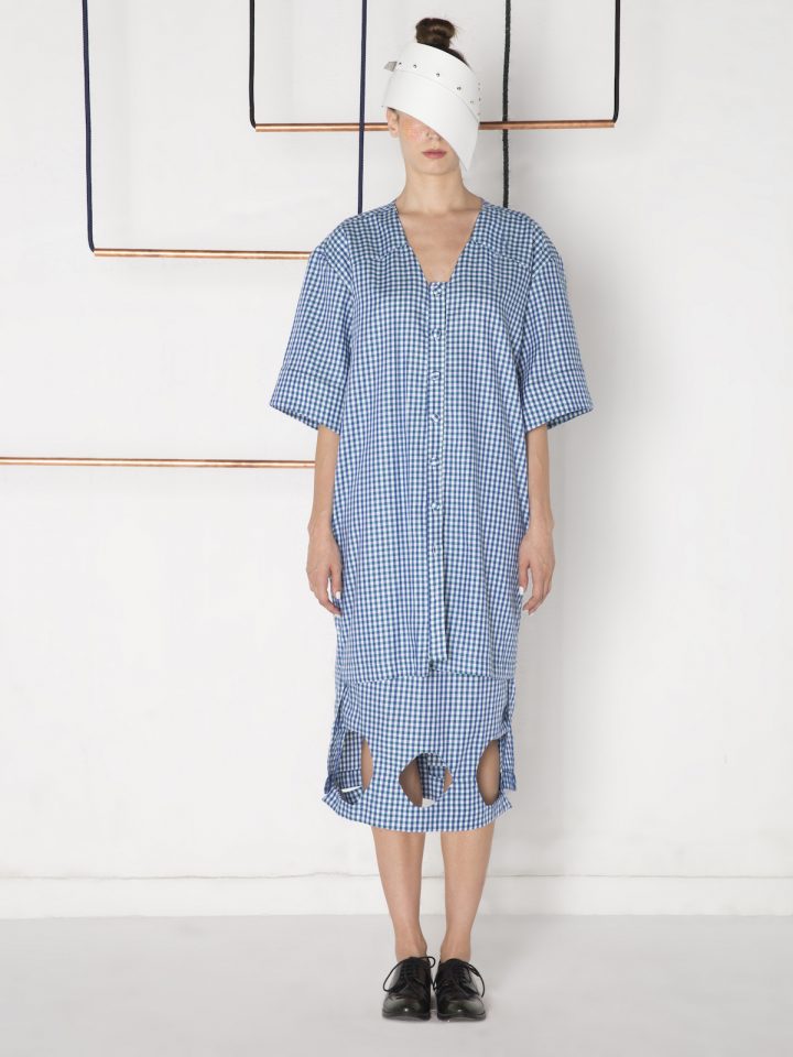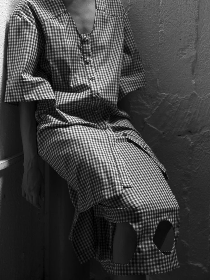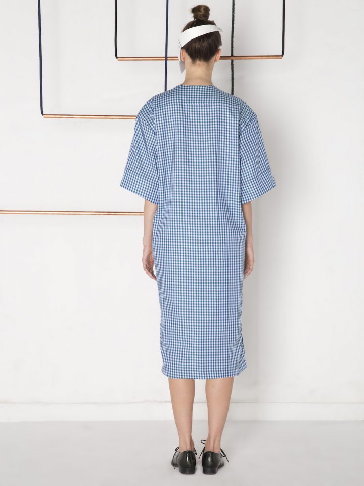 Petit carreau cotton shirtdress. Cotton is a Light-Weight, Non-stretchy fabric. 100% Cotton. Short-sleeved. Longer back hem. Button fastenings through front. Cut for a slightly loose fit. French seams. Machine wash 30°C. Model is 180cm and is wearing a size M