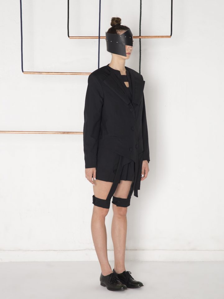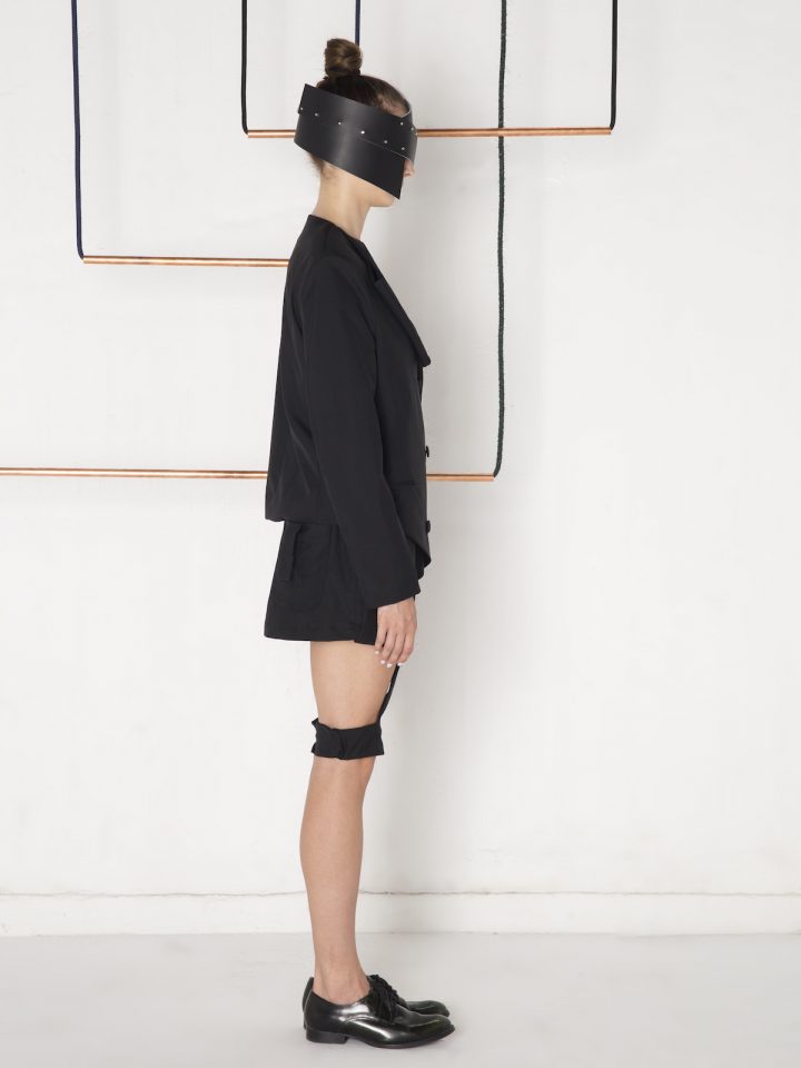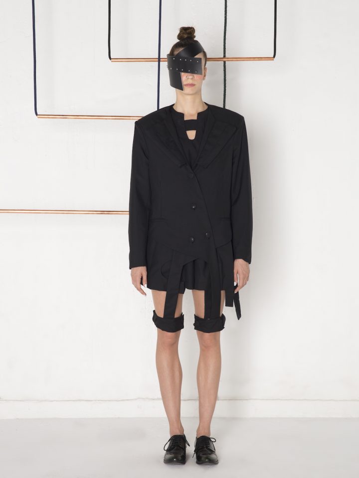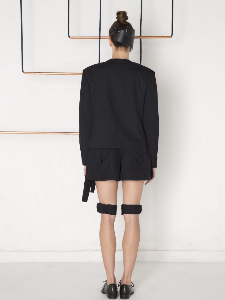 Black cool wool jacket. Cool wool is a Mid-weight, Non-stretchy fabric. 80% Cool Wool, 20% Dacron ; Lining 100% Viscose. Button fastenings at legs. 3D Lapels. Colarless. Button fastenings through front. Two internal pockets. Padded shoulders. Cut for a slightly loose fit. Fully lined. French seams. Dry clean. Model is 180cm and is wearing a size M